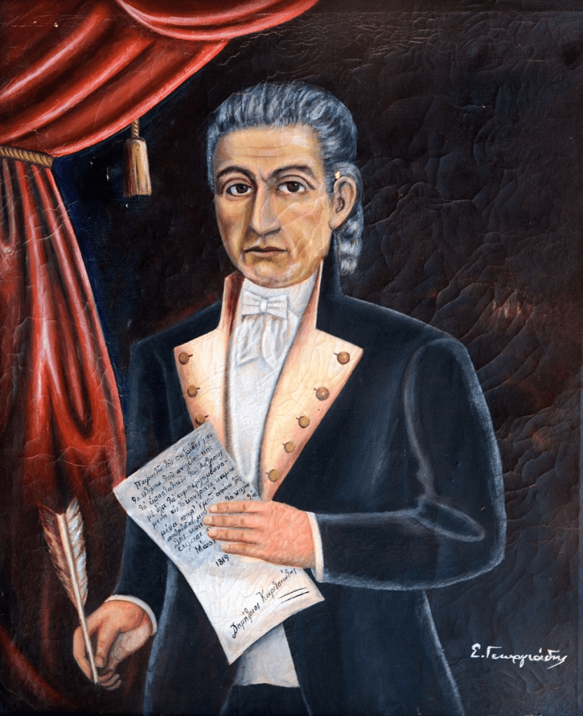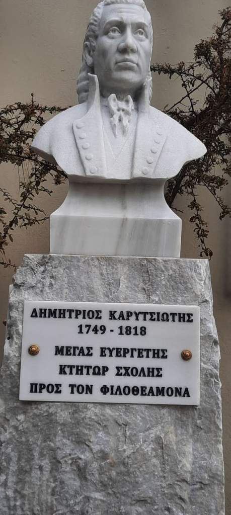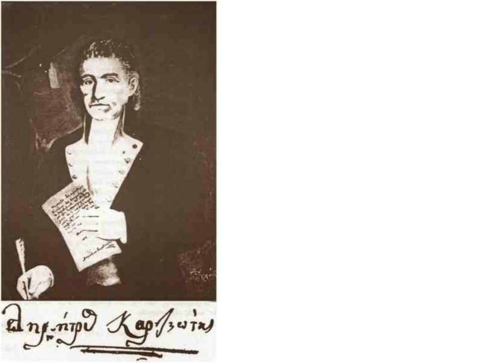 - «1798 ΕΝ ΜΗΝΙ ΙΟΥΛΙΩ 18 , Η ΣΧΟΛΗ ΠΡΟΣ ΤΟΝ ΦΙΛΟΘΕΑΜΟΝΑ . ΤΙ ΕΣΤΗΚΑΣ ΘΑΜΒΟΥΜΕΝΟΣ ΦΙΛΕ ΦΙΛΟΘΕΑΜΟΝ ΜΕ ΑΠΟΡΙΑΝ ΜΥΣΤΙΚΗΝ ΖΗΤΕΙΣ ΤΟ ΟΝΟΜΑ ΜΟΥ ΝΑ ΜΑΘΕΙΣ ΝΑ ΒΕΒΑΙΩΘΕΙΣ ΤΙ ΤΟ ΕΠΑΓΓΕΛΜΑ ΜΟΥ ΚΑΙ ΠΟΙΟΣ ΜΕ ΕΠΡΟΣΤΑΤΕΥΣΕ ΚΙ ΑΥΤΟ ΤΟ ΚΑΜΩΜΑ ΜΟΥ…Ο ΤΟΠΟΣ ΟΠΟΥ ΒΡΙΣΚΟΜΑΙ ΕΙΝ’ Η ΑΥΤΟΥ ΠΑΤΡΙΔΑ ΚΑΡΥΤΣΙΩΤΗΣ ΛΕΓΕΤΑΙ ΠΑΝΤΟΥ Η ΑΥΤΗ ΦΑΜΙΛΙΑ….