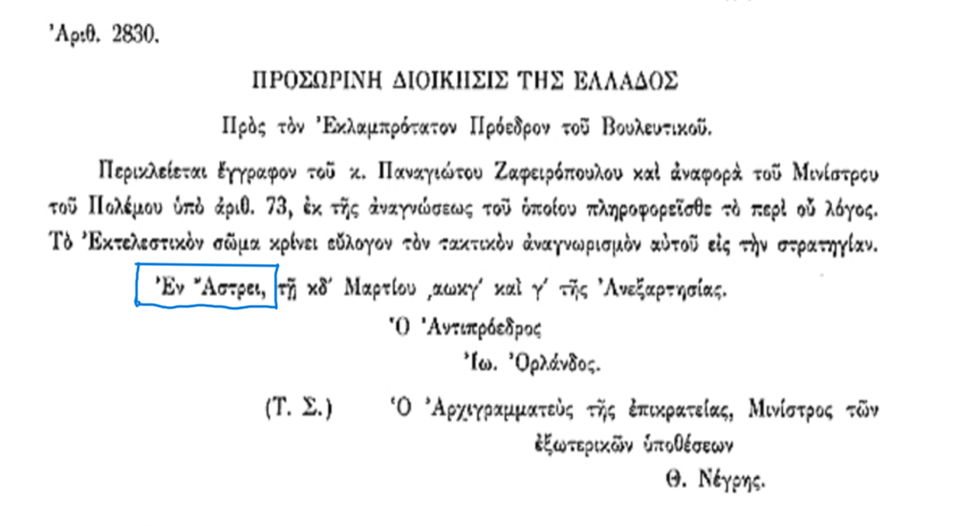 Από, Πρακτικά της Β’ Εθνικής των Ελλήνων Συνελεύσεως, Αρχεία της Ελληνικής Παλιγγενεσίας, (τόμος 3, σελ 63 ,σελ.87) . ΝΟΜΟΣ ΤΗΣ ΕΠΙΔΑΥΡΟΥ ΗΤΟΙ ΠΡΟΣΩΡΙΝΟΝ ΠΟΛΙΤΕΥΜΑ ΤΗΣ ΕΛΛΑΔΟΣ ΚΑΤΑ ΤΗΝ ΕΝ ΑΣΤΡΕΙ Β’ ΕΘΝΙΚΗΝ ΣΥΝΕΛΕΥΣΙΝ & ΠΡΑΚΤΙΚΑ ΤΗΣ Β’ ΕΘΝΙΚΗΣ ΤΩΝ ΕΛΛΗΝΩΝ ΣΥΝΕΛΕΥΣΕΩΣ ΣΥΓΚΡΟΤΗΘΕΙΣΗΣ ΕΝ ΑΣΤΡΕΙ ΤΗΝ ΚΘ’ ΜΑΡΤΙΟΥ, ΑΩΚΓ ΚΑΙ Γ’ ΤΗΣ ΑΝΕΞΑΡΤΗΣΙΑΣ .