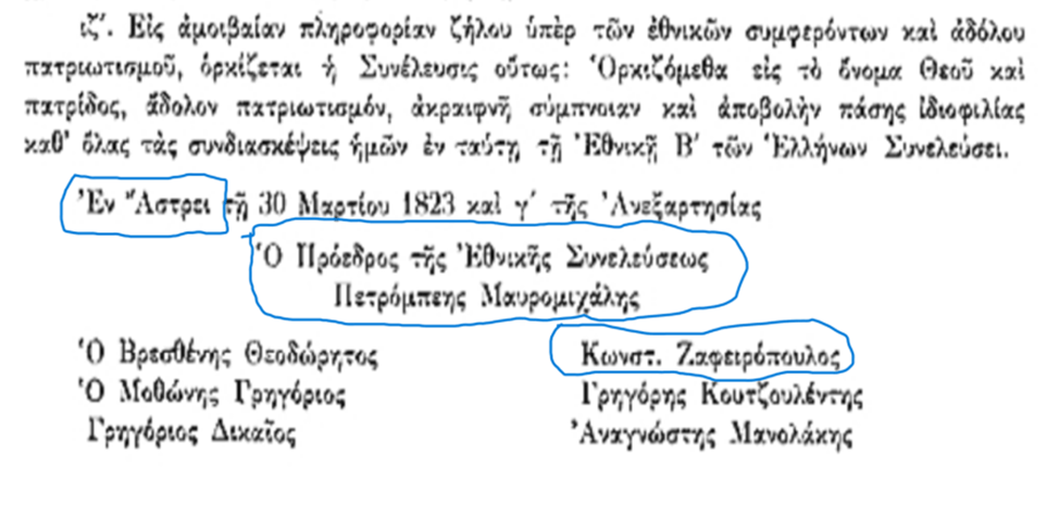 O Αλέξανδρος Μαυροκορδάτος, πρόεδρος του Εκτελεστικού (δηλ.Πρωθυπουργός ) , τέσσερις ημέρες μετά την Εθνοσυνέλευση στο Άστρος σε επιστολή στις 22 Απριλίου 1823 ,είχε γράψει στο Άστρος την 8ην Απριλίου 1823, ένα από τα τελευταία έγγραφα που υπογράφει ως πρόεδρος του Εκτελεστικού ανακοινώνει με «ευχάριστο καθήκον» στους ισχυρούς της εποχής , με ευφυέστατο τρόπο , «με τους καλύτερους οιωνούς» , το μεγάλο γεγονός, υπήρχε «η απελευθερωμένη Ελλάδα, «η Εθνοσυνέλευση της απελευθερωμένης Ελλάδας συνήλθε στο Άστρος»( Σμαράγδη Ι.Αρνανίτη :2023, Ἐν Ἄστρει Ἡ Ἐθνική Δευτέρα τῶν Ἑλλήνων Συνέλευσις, 29 Μαρτίου -18 Απριλίου 1823 , τα γεγονότα – οι πρωταγωνιστές – οι αποφάσεις. Αριστείδης Ν. Χατζής σελ 121).