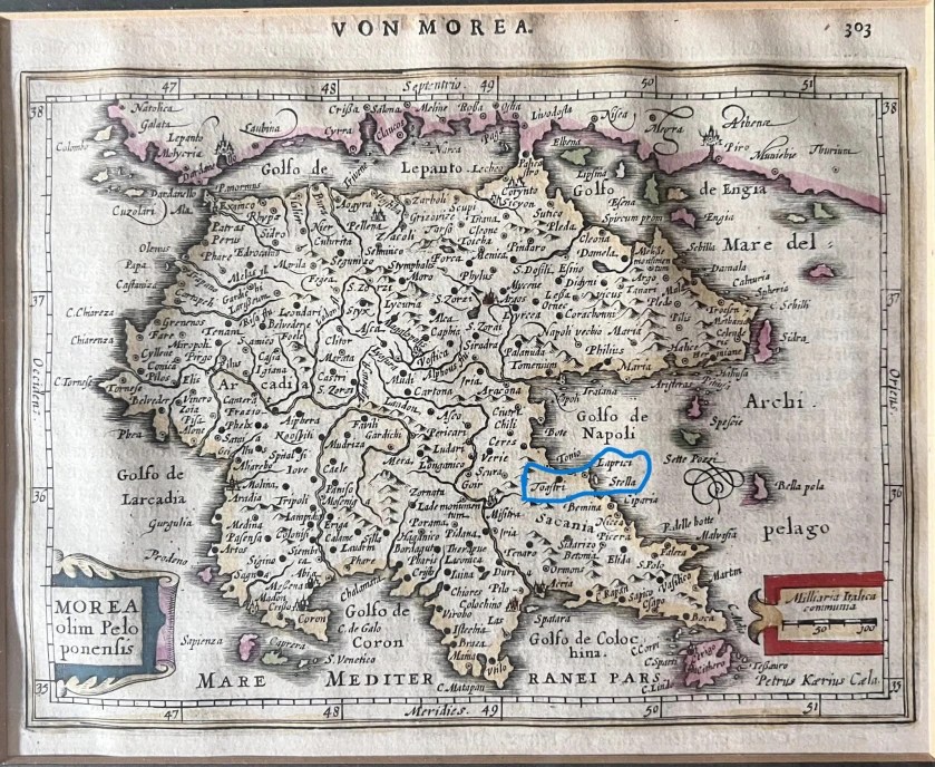 Στο παραπάνω χάρτη διακρίνονται στα ενδότερα ο οικισμός  Toastri, που είναι το σημερινό Άστρος, το σημείο  Laprici (Astritzi) που είναι το Κάστρο Παραλίου Άστρους και το νησί Stella που είναι η χερσόνησος του Παραλίου Άστρους . Σε διάφορες αναφορές του 1516, 1545,1547, 1570,1650 αναφέρονται το Toast(r)ι  ,Toastri, σαν μεσογειακό τοπογραφικό σημείο και ανατολικά , νότια ανατολικά,  βρίσκεται το τοπογραφικό σημείο Astritzi, Ostrici, Laprici σαν κάστρο  και Stella σαν νησί. Σε τοπικά φυλλάδια λανθασμένα η αναφορά στους Ενετικούς χάρτες Stella για την χερσόνησο Παραλίου Άστρους (ήταν νησί πριν τον 5ο π.χ. αιώνα) ανεξήγητα και ατεκμηρίωτα συγχέεται με το κάστρο Estella ,που βρίσκεται στον Αγιάννη του Άστρους. Το κάστρο του Παραλίου Άστρους, δεν αναφέρεται από κανέναν ιστορικό μελετητή με το όνομα Estella (Εστέλλα), αλλά πολλοί ιστορικοί μελετητές συμφωνούν είναι το κάστρο  Astritzi,  Astrici,  Ostrici,  Laprici . Υπάρχουν αρκετοί Ενετικοί χάρτες που αναφέρουν την χερσόνησο με το όνομα Stella  (Στέλλα) αλλά δεν υπάρχει χάρτης που αναφέρει την χερσόνησο η το κάστρο Παραλίου Άστρους με το όνομα Estella (Εστέλλα). Αυτονόητα άλλο είναι το νησί Stella , που είναι η χερσόνησος του Παραλίου Άστρους , και άλλο είναι το κάστρο Estella στον Αγιάννη.