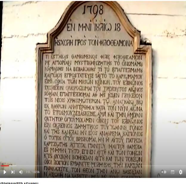 ΕΚ ΒΑΘΡΩΝ ΑΝΑΓΕΡΘΗΚΑ ΚΑΤΑ ΤΟΝ ΝΥΝ ΑΙΩΝΑ ΤΟ ΕΤΟΣ ΜΟΥ ΔΙΔΑΣΚΕΣΑΙ ΑΜΑ ΚΑΙ ΤΗΝ ΗΜΕΡΑΝΟ ΚΤΗΤΟΡ ΟΠΟΥ Μ’ ΕΚΑΝΕΝ ΟΙΚΟΝ ΤΟΥ ΕΛΙΚΩΝΟΣ ΕΙΝ’ Ο ΚΛΕΙΝΟΣ ΔΗΜΗΤΡΙΟΣ ΤΟΥ ΙΩΑΝΝΟΥ ΓΟΝΟΣ ΚΑΙ ΤΗΣ ΚΑΝΕΛΛΑΣ ΕΙΝ’ ΥΙΟΣ ΑΝΑΘΡΕΜΜΑ ΚΑΙ ΠΟΝΟΣ