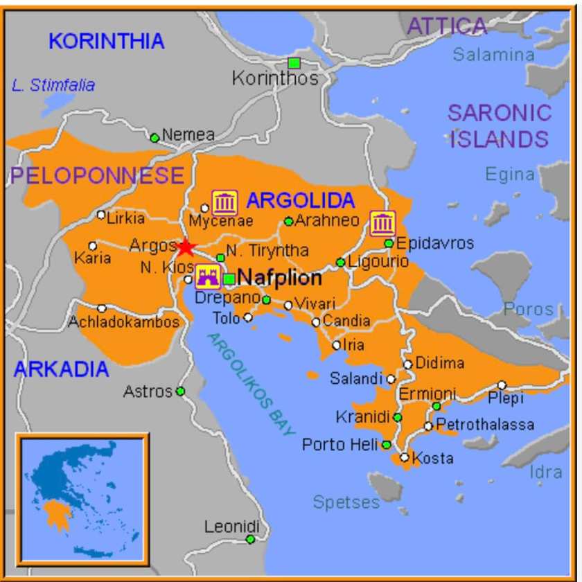 Στο παραπάνω χάρτη διακρίνονται στα ενδότερα από την αρχαιότητα το ιστορικόν Άργος και οι Μυκήνες , επίσης αργότερα στα ενδότερα βρίσκονται το Άστρος και το Λεωνίδιο. Στα νεότερα χρόνια επίσης στα ενδότερα βρίσκονται όλοι οι παλιότεροι οικισμοί της περιοχής , Άγιος Ανδρέας,(από τον οικισμό Άγιο Ανδρέα ονομάστηκε το Λιμάνι του Άγιου Ανδρέα, βέβαια από τους οικισμούς ονομάζονται τα λιμάνια), Κορακοβούνι ,Μελιγού,Κούτρουφα ,Βέρβενα και Δολιανά.